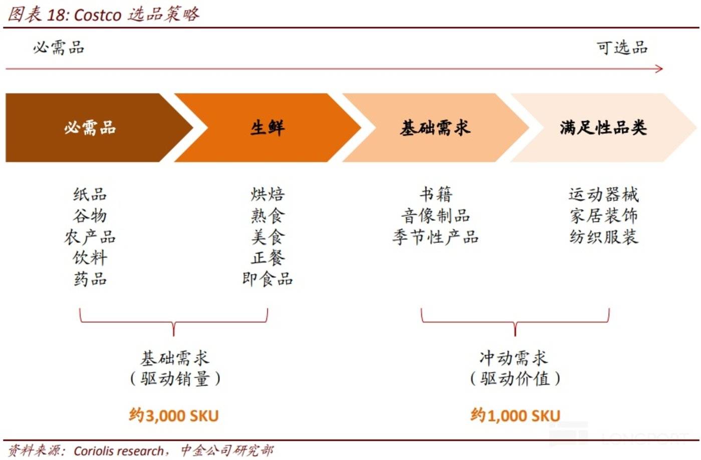 商品 SKU 总数量上,Costco 的选择是 「少」(而精)。Costco 的 SKU 数量普遍仅在 4000 上下,远低于常规大型超市 20,000 左右的 SKU 数量。且商品种类结构上,Costco 仅有的 SKU 中的 3/4,是分配给食物和日常必须品等高频、刚需类商品。仅有 1/4 是分配给服饰家居、电器玩具等低频、可选的商品。