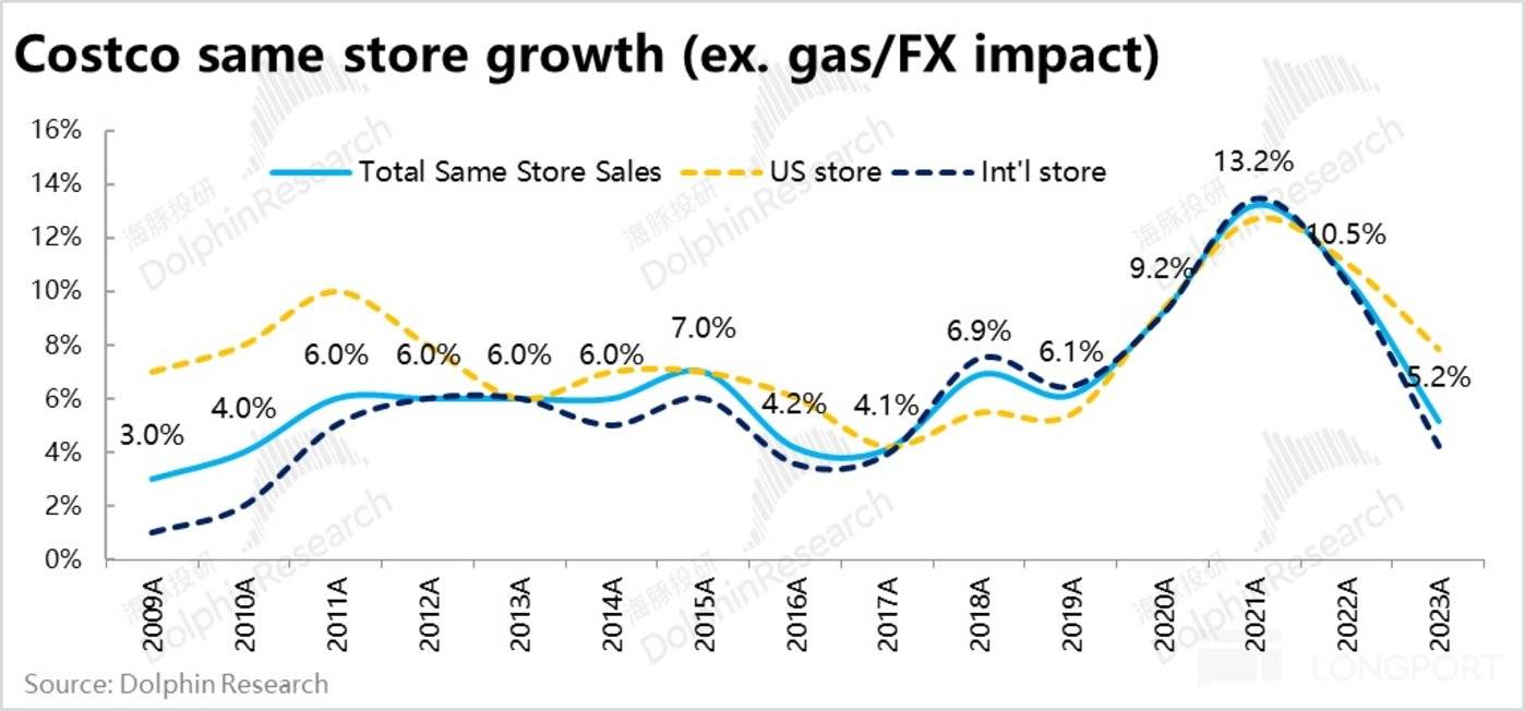 而 Costco 持续且稳定的单店销售增长则更为稀缺且珍贵,Costco 在过去近 25 年的平均单店销售复合增速为 4.5%,而剔除新开业门店对单店销售的拖累,以及汇率和汽油价格波动这种不可控因素,Costco 从 09 年至 23 年同店可比复合增速实际达到 6%,且即便是在金融危机影响的 09 年,可比同店销售依旧同比增长了 3%。换言之,Costco 持续稳定、近乎从不 「掉链子」 的单店销售增长,是其业绩能穿越经济和消费周期的关键原因。