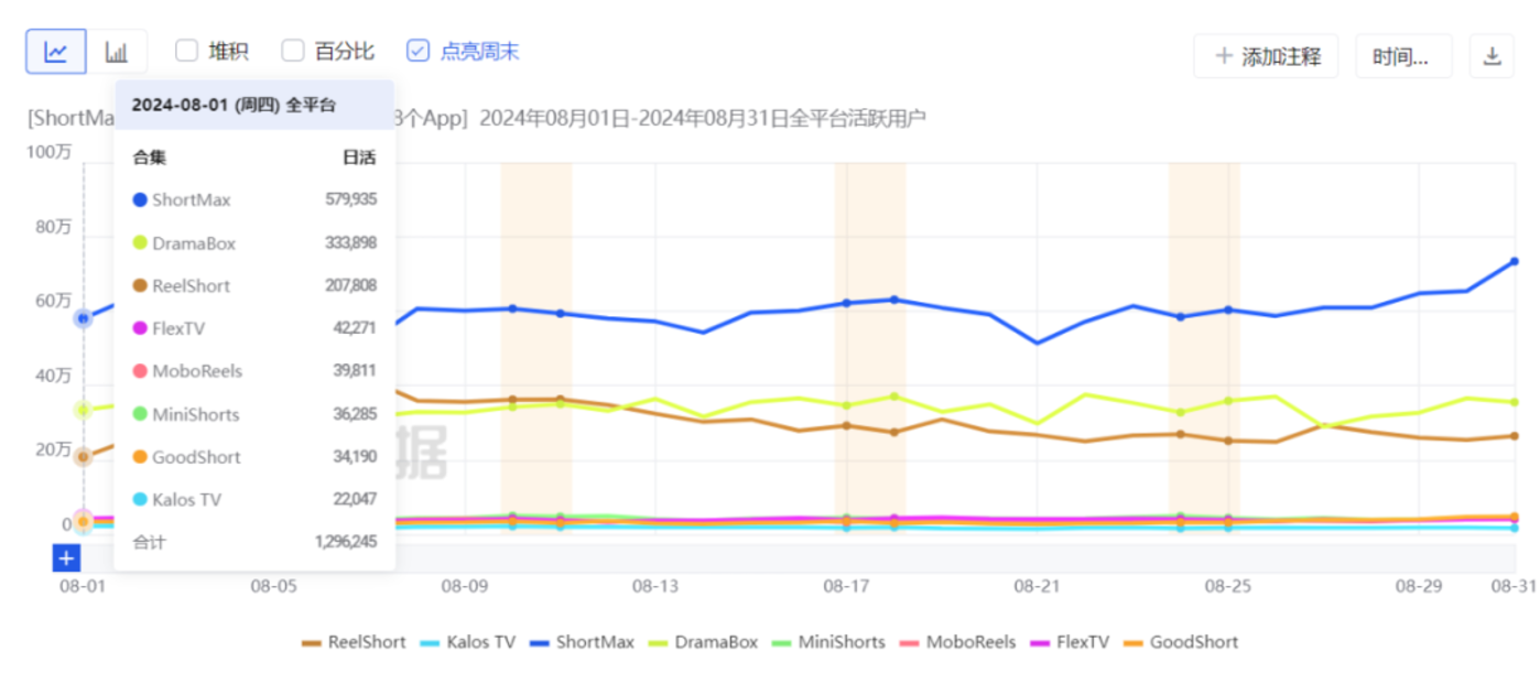 用户活跃度方面,ShortMax 遥遥领先,其 DAU 保持在 50 万到 60 万之间。