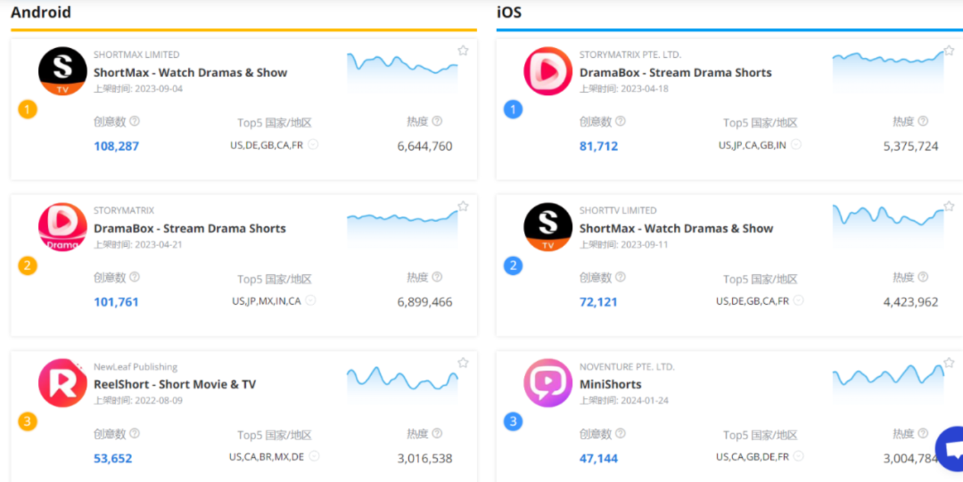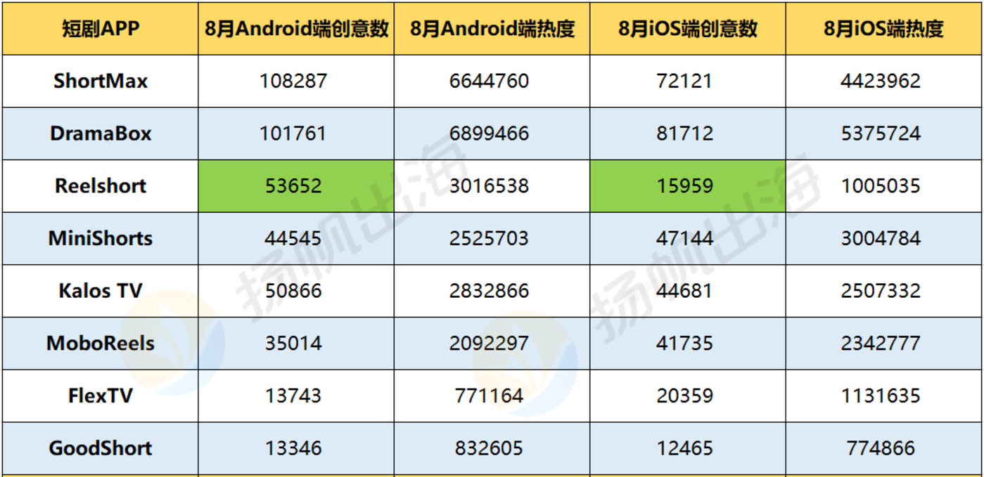 广大大数据显示,8 月份,ShortMax、DramaBox、Reelshort 为安卓渠道投放的前三名,DramaBox、ShortMax、MiniShorts 为 iOS 渠道下的投放前三位。