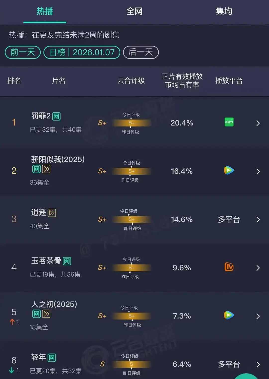 虽说舆论场上对女尊的讨论颇多,但市场用脚投票,《玉茗茶骨》 在 1 月 7 日当天云合的市占率仅为 9.6%,比第三名的老套古偶 《逍遥》(男主也是侯明昊) 还是低了 5 个点。向来喜欢在宣传期上蹿下跳的于正,这一次也只是贡献了个把热搜 #玉茗茶骨不爆是因为长剧没有观众 #。