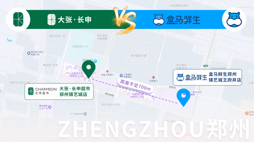 事实上,早在 2025 年 5 月,大张便已官宣将在郑州锦艺城布局长申超市门店。值得关注的是,该店与同在锦艺城的盒马门店直线距离仅 700 米,这般超近距离的“ 贴身肉搏”,在中国零售商业史上颇为少见。