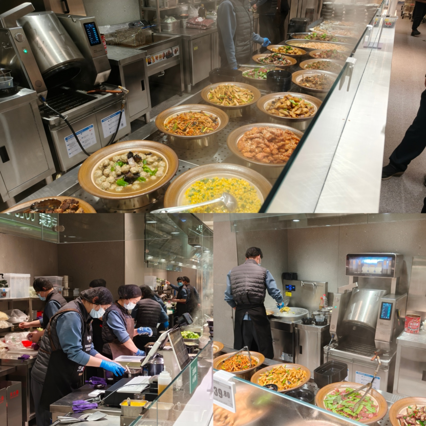 新增的现炒菜档口则提供丰富菜品选择,价格分为三档:19.8 元/500g、39.8 元/500g、59.8 元/500g,由炒菜机器人与工作人员现场炒制出锅,兼顾效率与新鲜。
