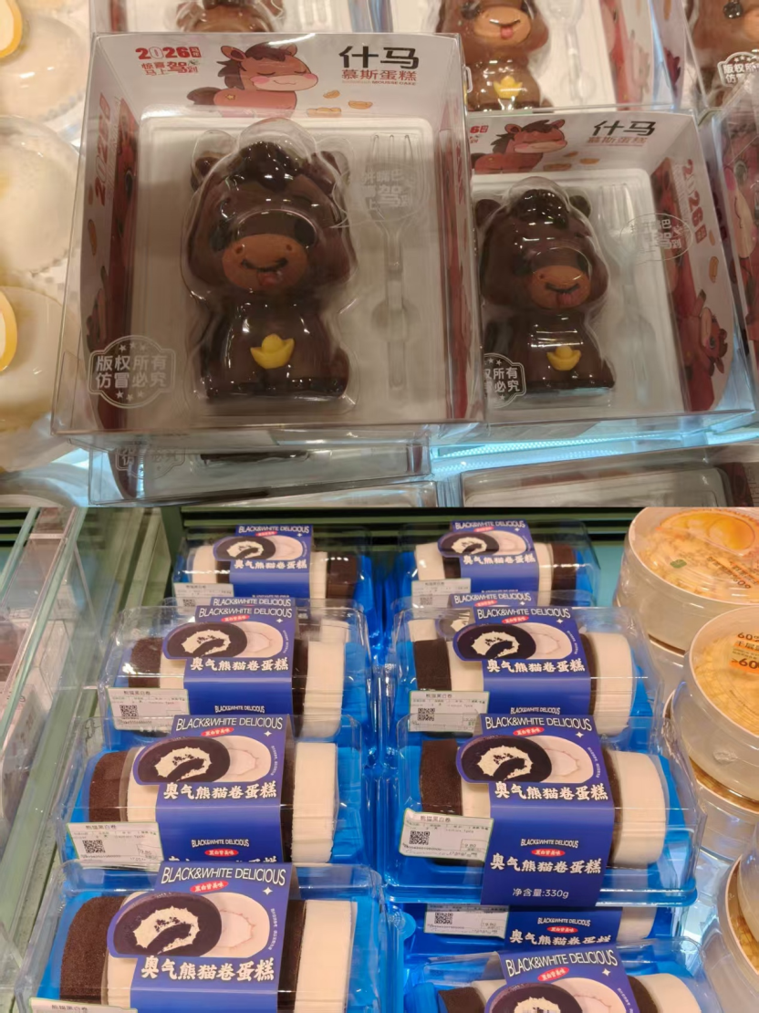 烘焙品类的创新与口味丰富度更是亮点,例如 2026 年新年特别版什马慕斯蛋糕,以及对标盒马“ 奥利奥卷蛋糕” 的奥气熊猫卷蛋糕等新品,持续吸引消费者关注。