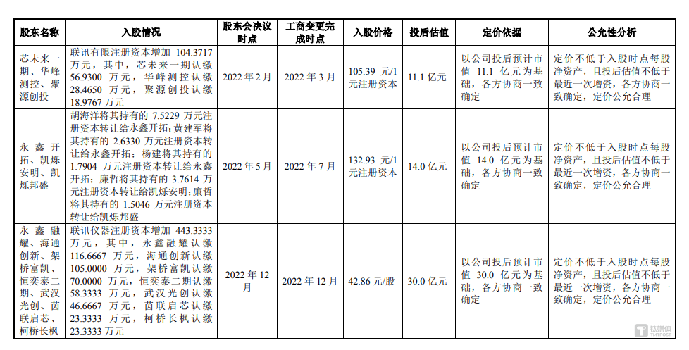 而在公司发展历程中,2022 年出现的估值短期大幅飙升现象备受关注。2022 年 2 月,芯未来一期、华峰测控、聚源创投以 105.39 元/1 元注册资本的价格对联讯仪器进行了增资,公司投后估值 11.1 亿元;2022 年 5 月,胡海洋将其持有的 7.5229 万元注册资本转让给永鑫开拓;黄建军将其持有的 2.6330 万元注册资本转让给永鑫开拓;杨建将其持有的 1.7904 万元注册资本转让给永鑫开拓;廉哲将其持有的 3.7614 万元注册资本转让给凯烁安明;廉哲将其持有的 1.5046 万元注册资本转让给凯烁邦盛,转让价格均为 132.93 元/1 元注册资本,公司投后估值 14 亿元;2022 年 12 月,永鑫融耀、海通创新、架桥富凯、恒奕泰二期、武汉光创、茵联启芯、柯桥长枫以 42.86 元/股价格向联讯仪器进行了增资,公司投后估值 30 亿元,这也意味着,在 2022 年 3 月-2022 年 12 月,短短 9 个月的时间内,联讯仪器的估值暴增了 2.7 倍。