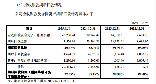 而导致经营性现金变现能力糟糕的核心原因,是应收账款的持续激增。据悉,截至 2022 年末、2023 年末、2024 年末、2025 年 9 月末,公司应收账款的账面余额分别为 8,962.97 万元、13,559.08 万元、25,455.43 万元和 40,001.69 万元,占当期营业收入的比例分别为 41.81%、49.16%、32.28% 和 37.24%,应收账款规模随营收增长持续走高,成为资金占用的主要板块。