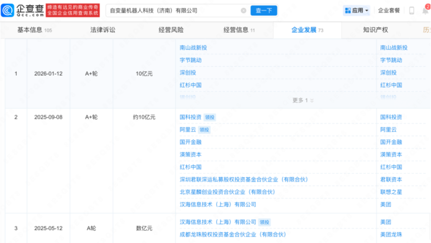 技术上的领先,让自变量获得了资本市场的青睐。企查查信息显示,自变量机器人已累计获得 9 次融资,融资至 A++轮,其中更有 2025 年 5 月美团独投的数亿元 A 轮融资,以及 9 月份阿里云的参投。