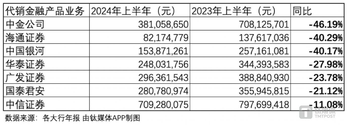 钛媒体 APP 分析了 7 家头部券商发现,2024 年上半年它们的代销收入的均出现了两位数的跌幅,主要原因是权益类公募基金发行和销售承压。