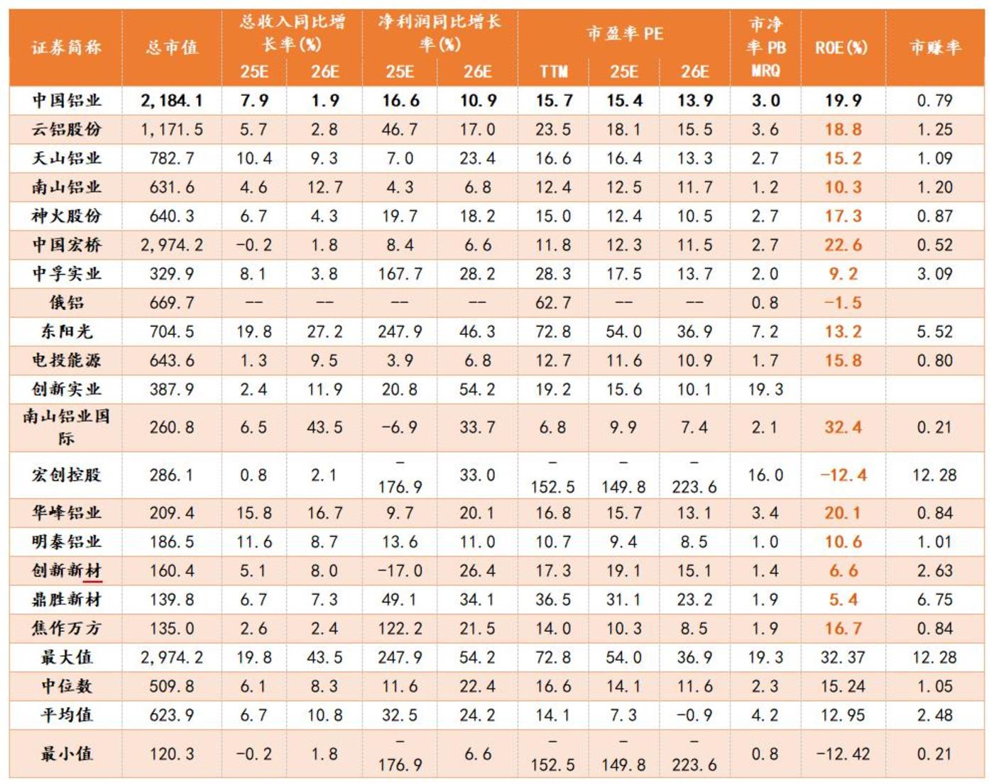 ROE 居前的是南山铝业、华峰铝业、中国宏桥、中国铝业等。