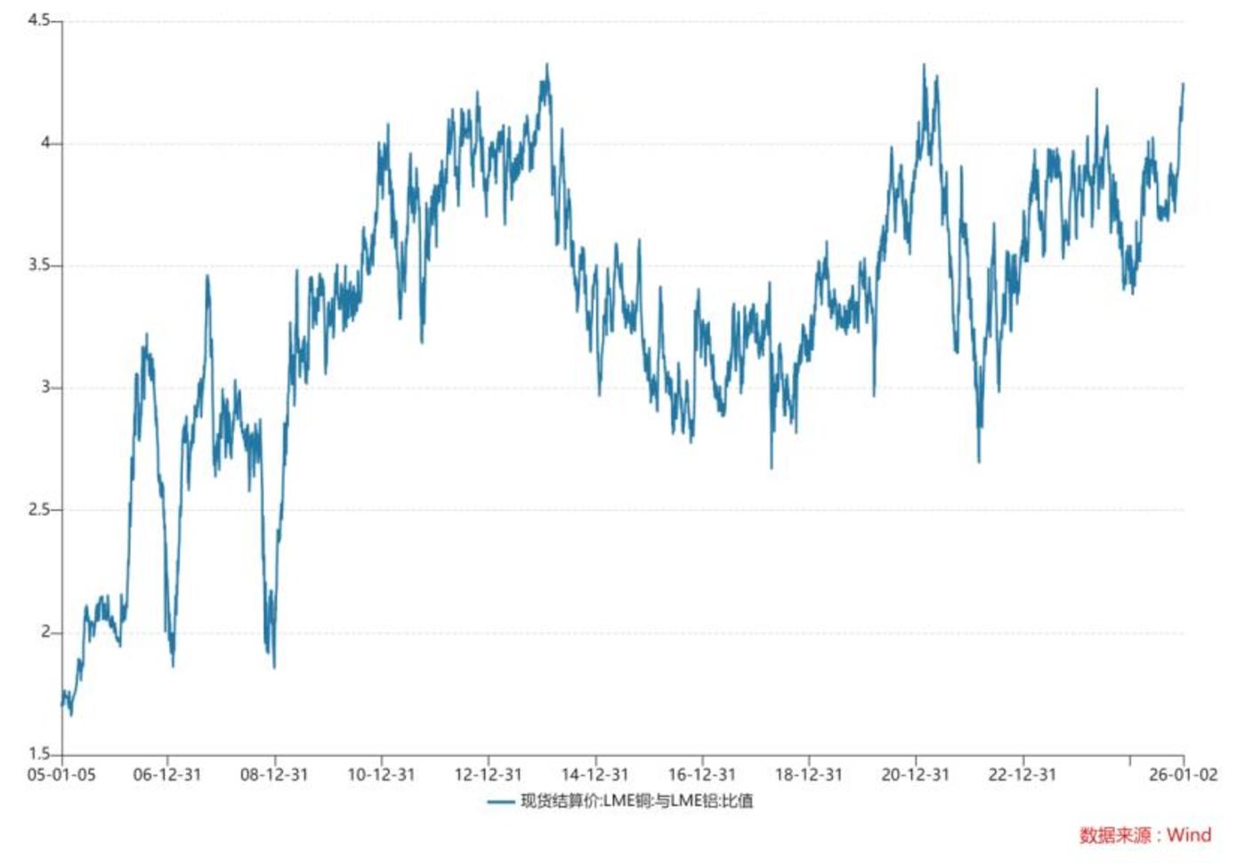 当前铜铝价格比值已处于近 20 年以来的历史高位区间,该比值自 2005 年 1.7 倍的低点起,整体呈现震荡上行态势,截至目前已攀升至 4.21 倍的水平。