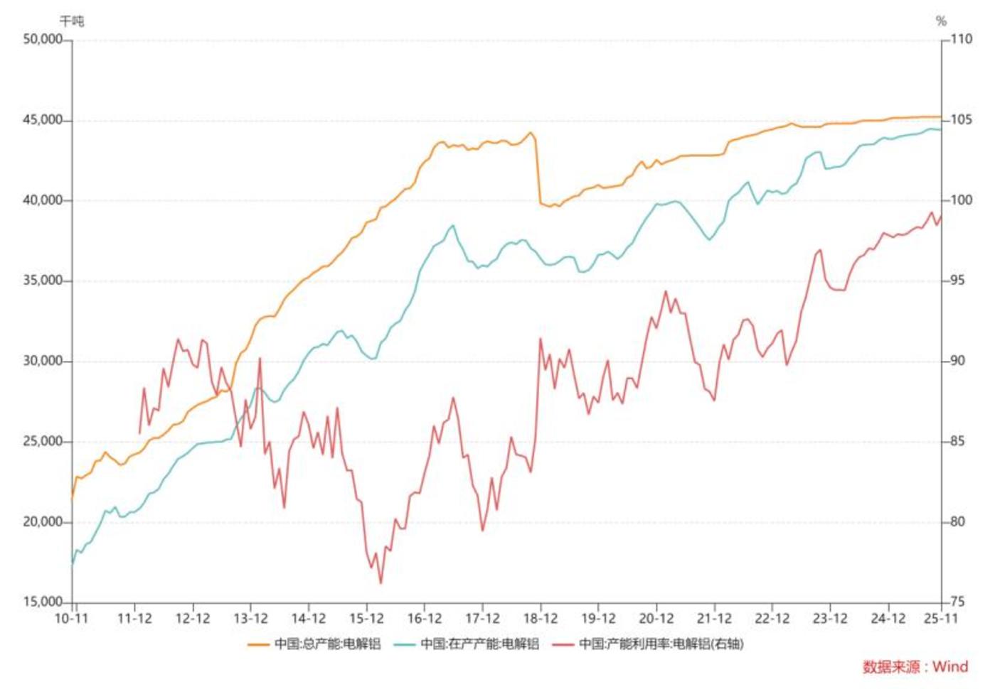 截至 25 年 10 月,我国电解铝总产能 4523.2 万吨,未来产能以置换为主,政策层面已锁定上限。24 年以来产能利用率 94.46% 上升至 99% 左右,接近满产。