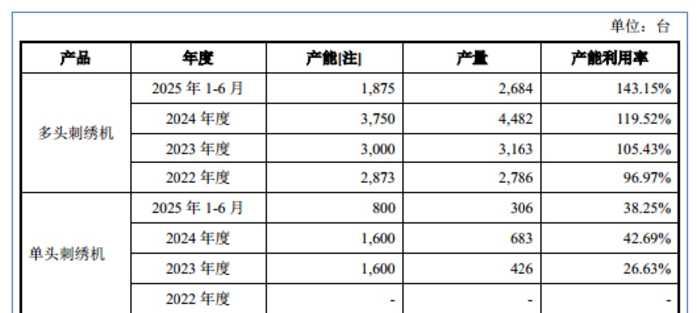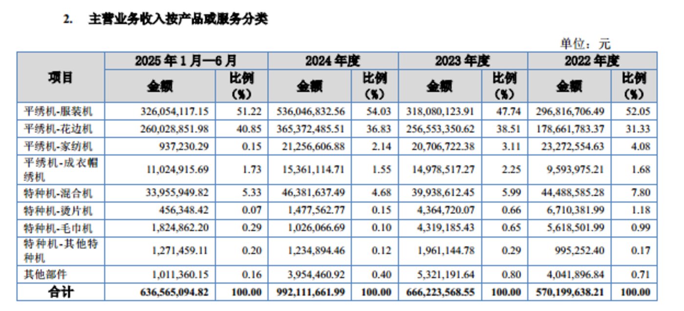 其中服装机与花边机构成公司营收的核心支柱。2022 年-2024 年及 2025 年 1-6 月 (下称 「报告期」),服装机销售收入分别为 2.97 亿元、3.18 亿元、5.36 亿元、3.26 亿元,占主营业务收入比例为 52.05%、47.74%、54.03%、51.22%;花边机销售收入分别为 1.79 亿元、2.57 亿元、3.65 亿元、2.6 亿元,占比达 31.33%、38.51%、36.82%、40.85%,两大产品合计贡献超 8 成营收,成为业绩增长的核心驱动力。