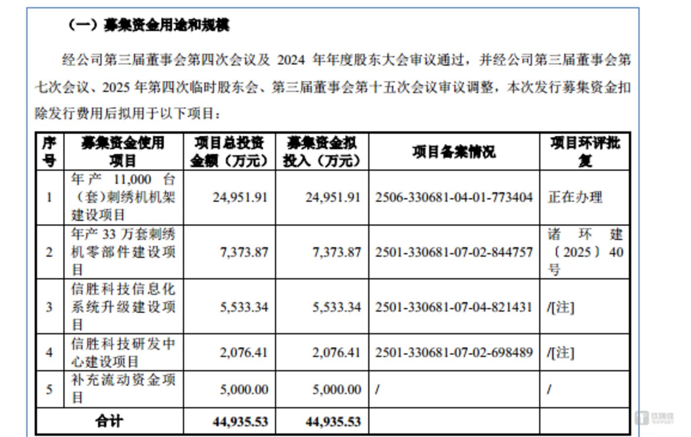 信胜科技此次 IPO 欲募集 44935.53 万元,分别用于年产 11,000 台 (套) 刺绣机机架建设项目、年产 33 万套刺绣机零部件建设项目、信胜科技信息化系统升级建设项目、信胜科技研发中心建设项目、补充流动资金项目,具体情况如下: