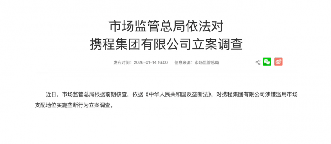 【TechWeb】1 月 14 日消息,据国家市场监督管理总局消息,近日,市场监管总局根据前期核查,依据 《中华人民共和国反垄断法》,对携程集团有限公司涉嫌滥用市场支配地位实施垄断行为立案调查。