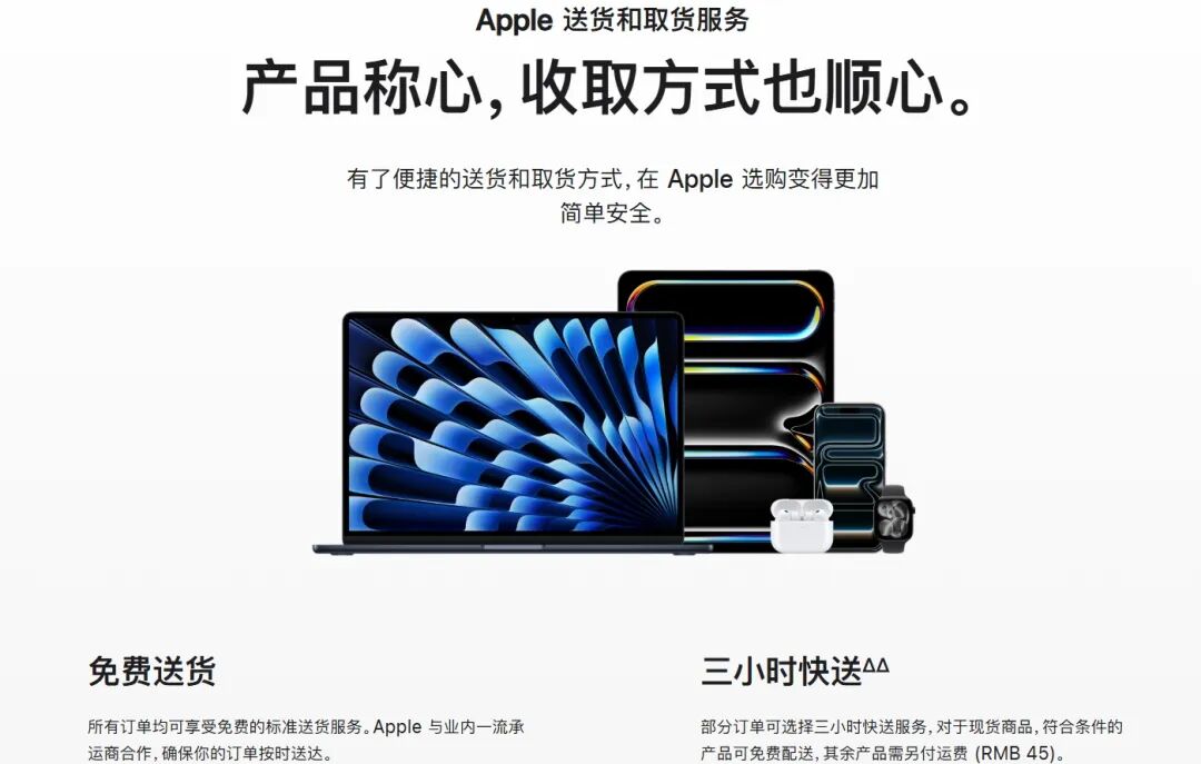 苹果也卷起了“ 半小时达”,9 月 iPhone 17 系列新机开售时,全国 4000 多家 Apple 授权专营店网络接入美团闪购、淘宝闪购,提供正品现货 30 分钟送达服务。最近苹果还在官网正式上线“3 小时快送服务”,免费配送 iPhone、iPad、Apple Watch、Macbook Pro、Macbook Air 和 AirPods 等产品。