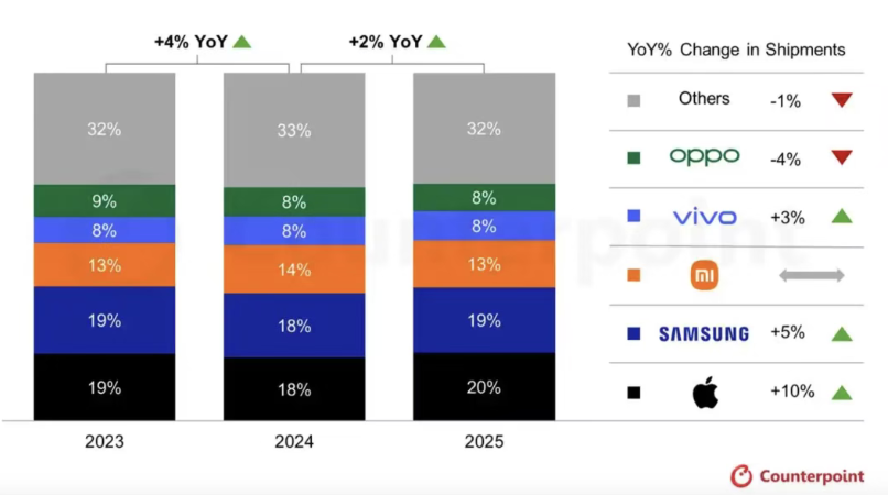 根据 Counterpoint 最新发布的数据,2025 年全球智能手机出货量同比微增 2%,苹果以 20% 的市场份额超越三星,时隔 14 年重返全球第一宝座,小米、vivo、OPPO 分列 3-5 位。