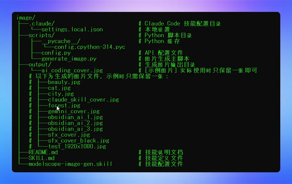 Claude 会自动根据你的自然语言调用这个生图 skill
