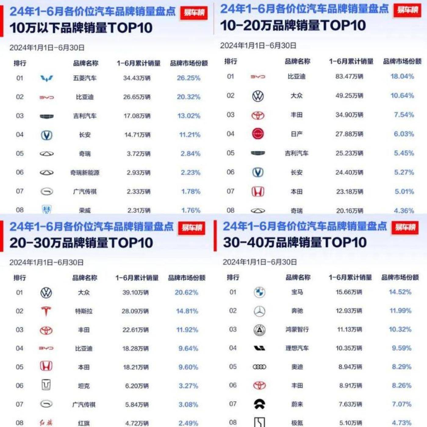 据易车榜统计数据显示,今年上半年,在 10-20 万元汽车市场中比亚迪累销 83.47 万辆,市占率 18.04%;在 20-30 万元市场中比亚迪累销 18.28 万辆,市占率 9.64%。