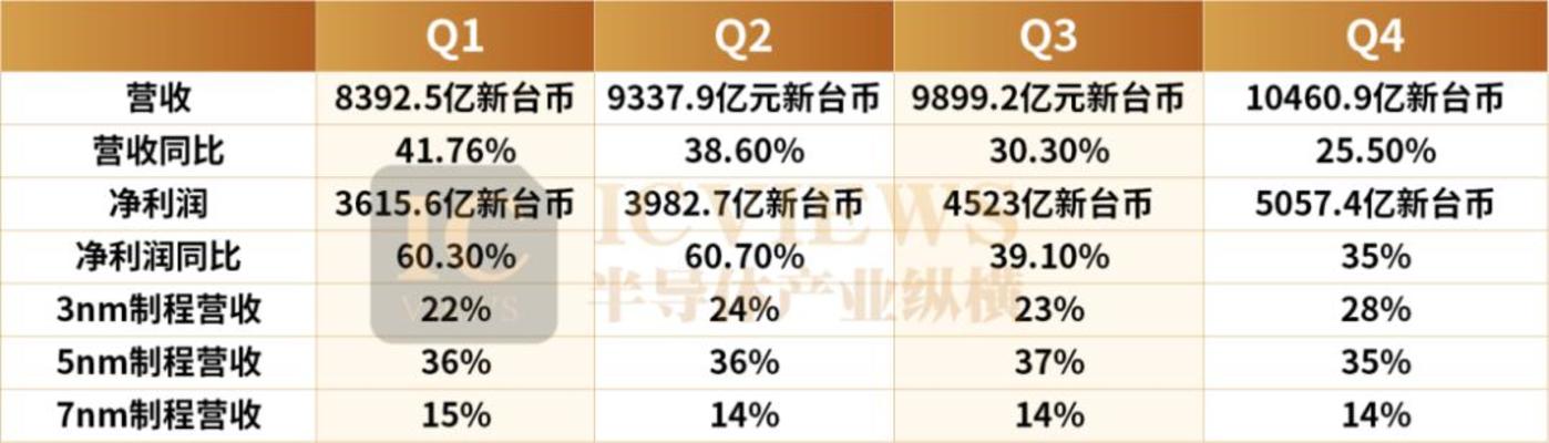 结合本次披露的 Q4 营收数据,可完整梳理出 2025 年全年营收情况,台积电全年营收 1224.2 亿美元,同比增长 35.9%;EPS 66.25 新台币,增长 46.4%。
