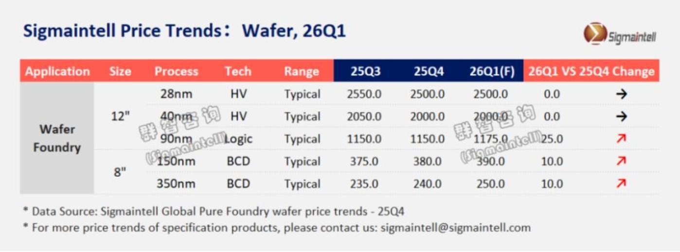 分制程来看,8 英寸晶圆产线延续了此前的满载状态,相关产品价格已进入上行通道;而 12 英寸制程中,55nm、90nm 等成熟工艺的供需关系正持续趋紧,市场预计 2026 年将迎来一轮普涨行情。