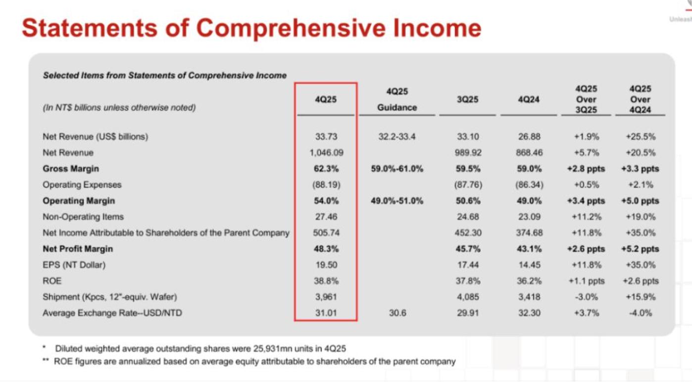 2025 年 Q4,台积电营收 336.7 亿美元 (10460.9 亿新台币),同比增长 25.5%,环比增长 5.7%。净利润 5057.4 亿新台币,同比暴增 35%,这是台积电连续第八个季度实现利润同比增长。净利率达 48.3%,毛利率 62.3%。