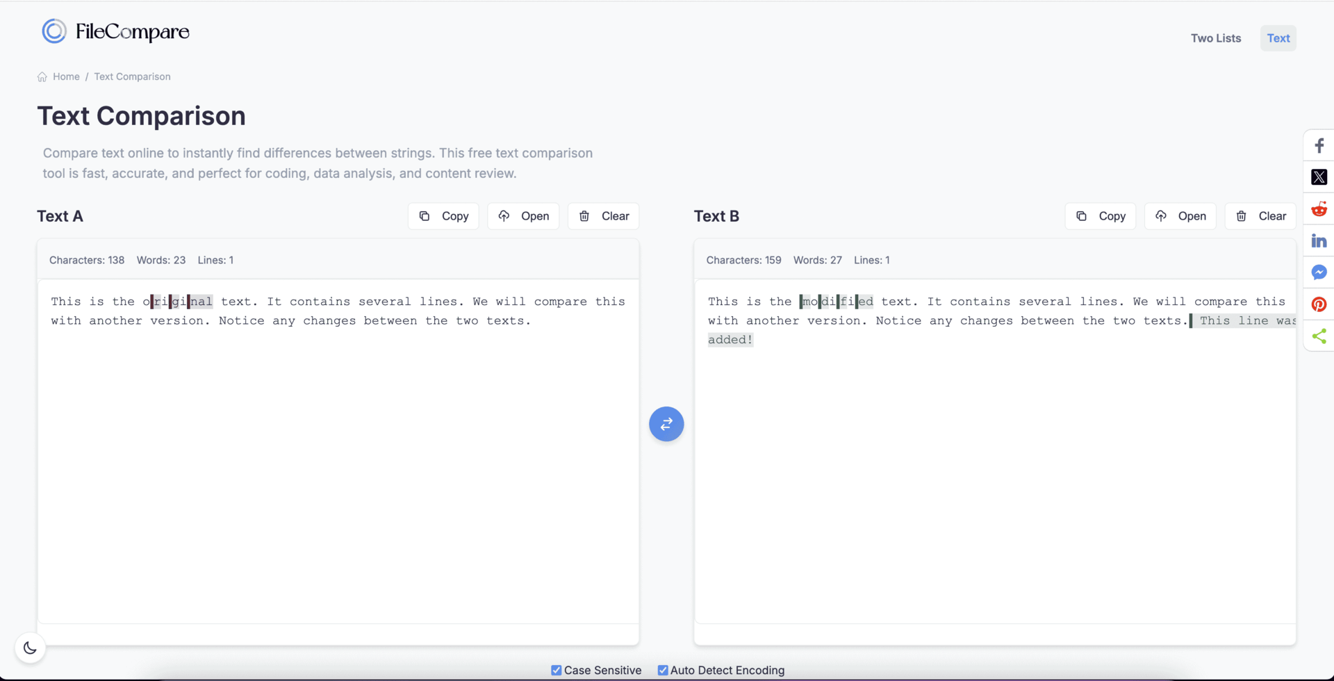 一个简单而强大的在线文本与文件对比工具。它能快速比对两个列表、文本片段或文件内容,精准标注出增加、删除或修改的差异。非常适合代码审阅、数据去重或文档校对工作。