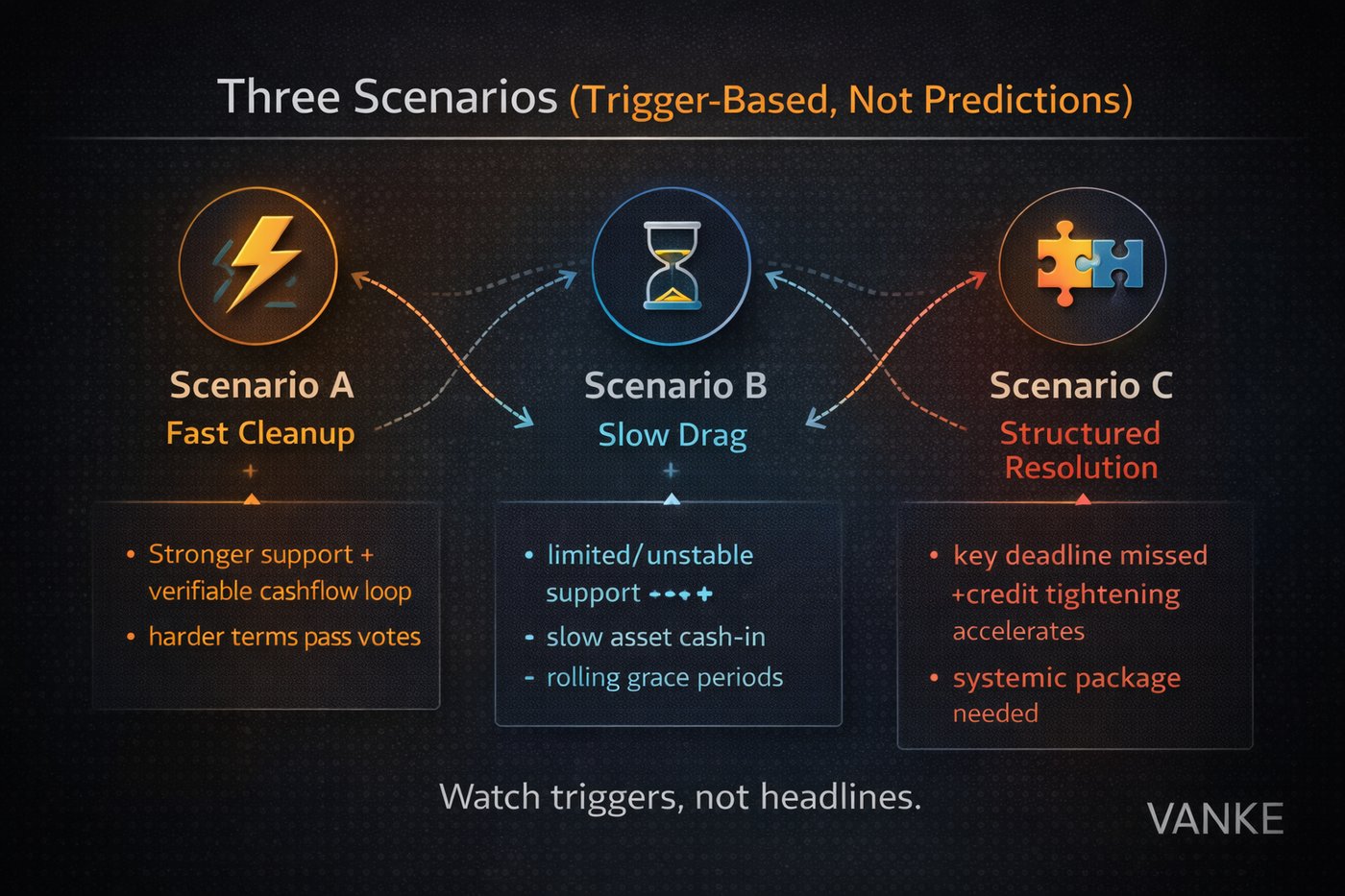 第三条路径是结构方案升级:若关键节点失守,信用标签与市场价格进一步恶化并反向挤压融资,处置方式可能从逐笔谈判转向更系统的整体方案。它意味着解决方式升级,也意味着约束更强、透明度更高。