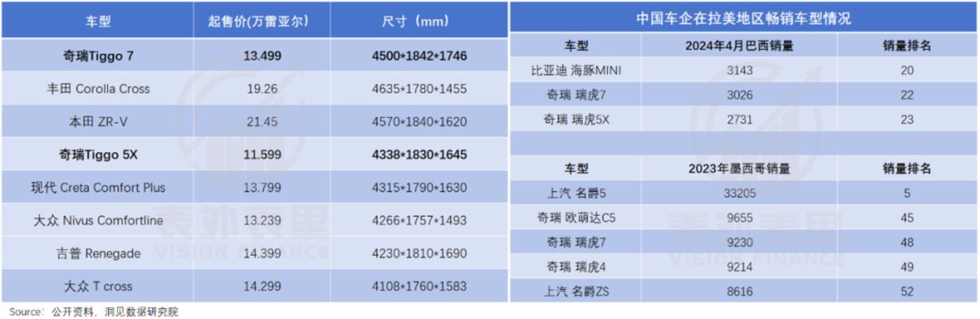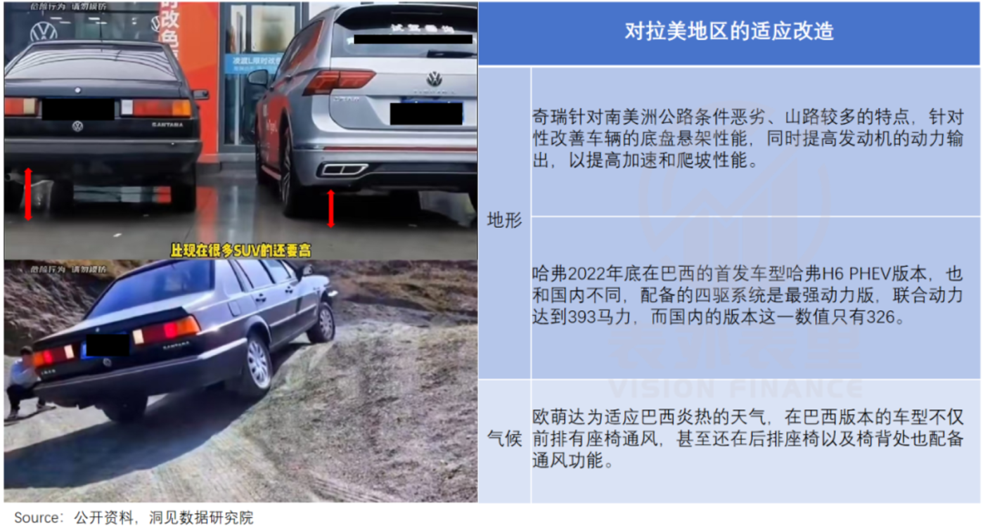 奇瑞瑞虎、上汽名爵等一上来就主推空间更大的 SUV,并针对性提高了动力和底盘,一步到位应对拉美的路况——就像 40 年前国产桑塔纳把轿车的底盘做到逼近 SUV 的高度一样。