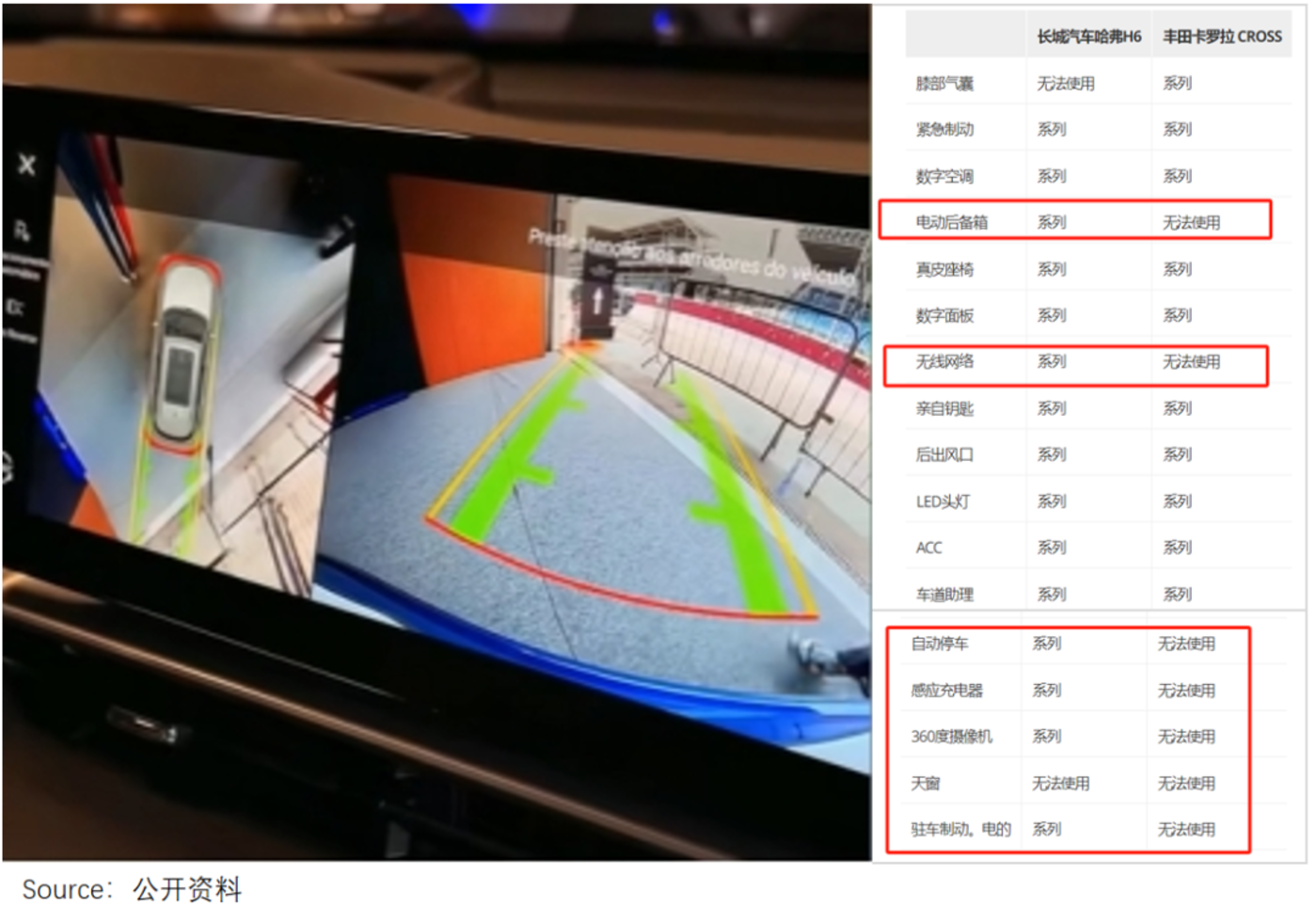 如丰田在巴西推的卡罗拉 Cross,价格和哈弗 H6 PHEV 看齐,但性能配置显得逊色:前者的屏幕只有 7 英寸,且只能听歌和导航;后者直接 10 英寸起,能语音控制空调温度、天窗和尾门,还能 360 度无死角显示周边障碍以及距离。