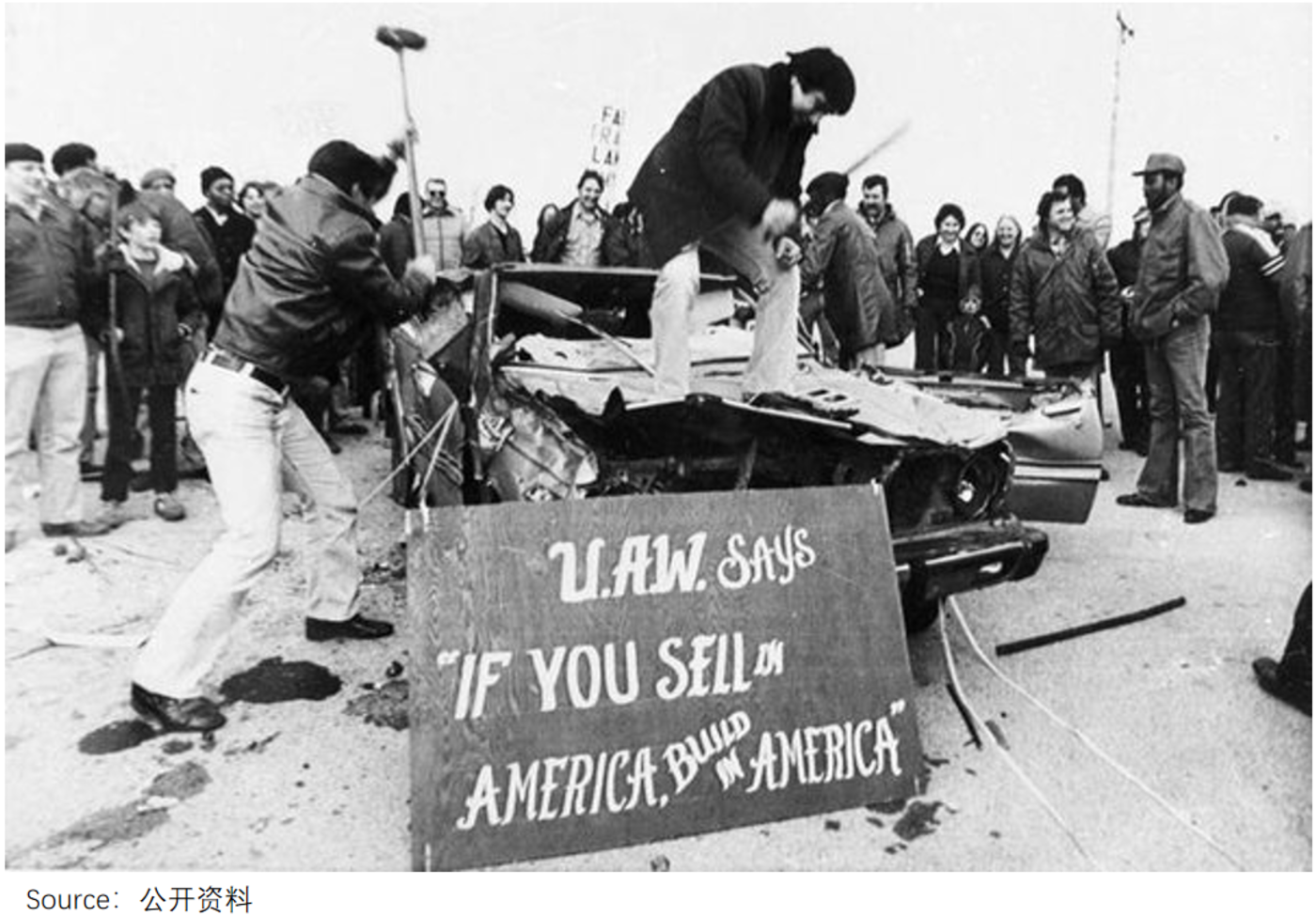 彼时日本汽车在美国的大行其道,不可避免冲击了本土汽车产业——汽车三巨头通用、福特、克莱斯勒全都亏损、大量解雇工人,招致了反噬。
