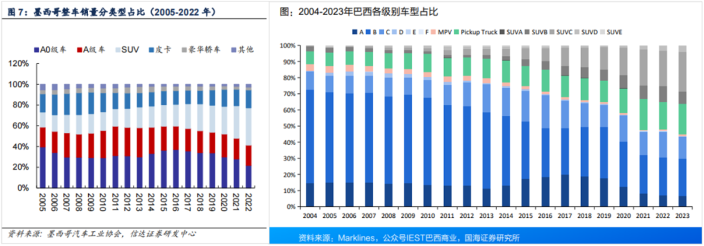 这看起来与海外市场的行情有些出入——拉美、东南亚、中亚等国内汽车重点出口区域,都是小型车当道,拉美直到 2023 年低端微型和紧凑型轿车占比仍超 40%。
