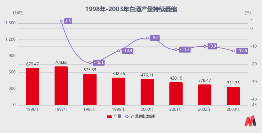 接连暴击后,白酒行业总产量从 1998 年开始连续 6 年负增长,2003 年已萎缩至 331.35 万吨,不及 1997 年总产量的一半,「白酒夕阳论」 充斥市场。