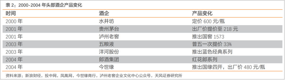但经过这两三年积累的品牌在 2004 年行业步入新一轮上行周期后迎来爆发,高端酒、次高端酒、大众酒梯队逐渐清晰。