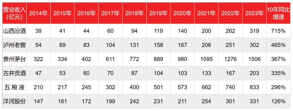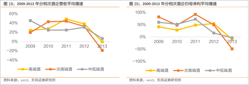 当时,四万亿计划带动的政商务白酒消费让整个行业历过史上最繁荣的 4 年,酒企整体年营收平均增速均达到 20% 以上,次高端酒企年归母净利平均增速超 50%。