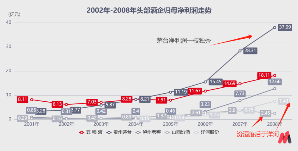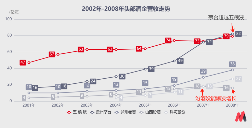 第一个 「垃圾时间」 后期,我国成功加入 WTO,政务用酒需求激增,中高端白酒风潮开启,借助酒店盘中盘模式快速崛起了一批白酒品牌。其中茅台、洋河的增速最为突出,已经引领行业的五粮液则开始横向做系列酒,为之后的发展埋下了祸根。