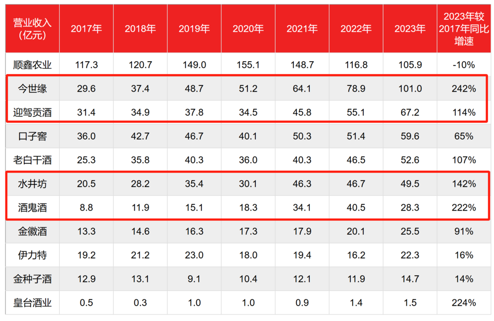 另外,头部酒企们提价为区域酒企腾出了空间,于是古井贡、迎驾贡酒、今世缘等区域酒企顺势进行产品结构升级,也纷纷迎来快速成长。其他后知后觉的地方酒企,如口子窖、顺鑫农业、老白干酒等增长则不尽人意。