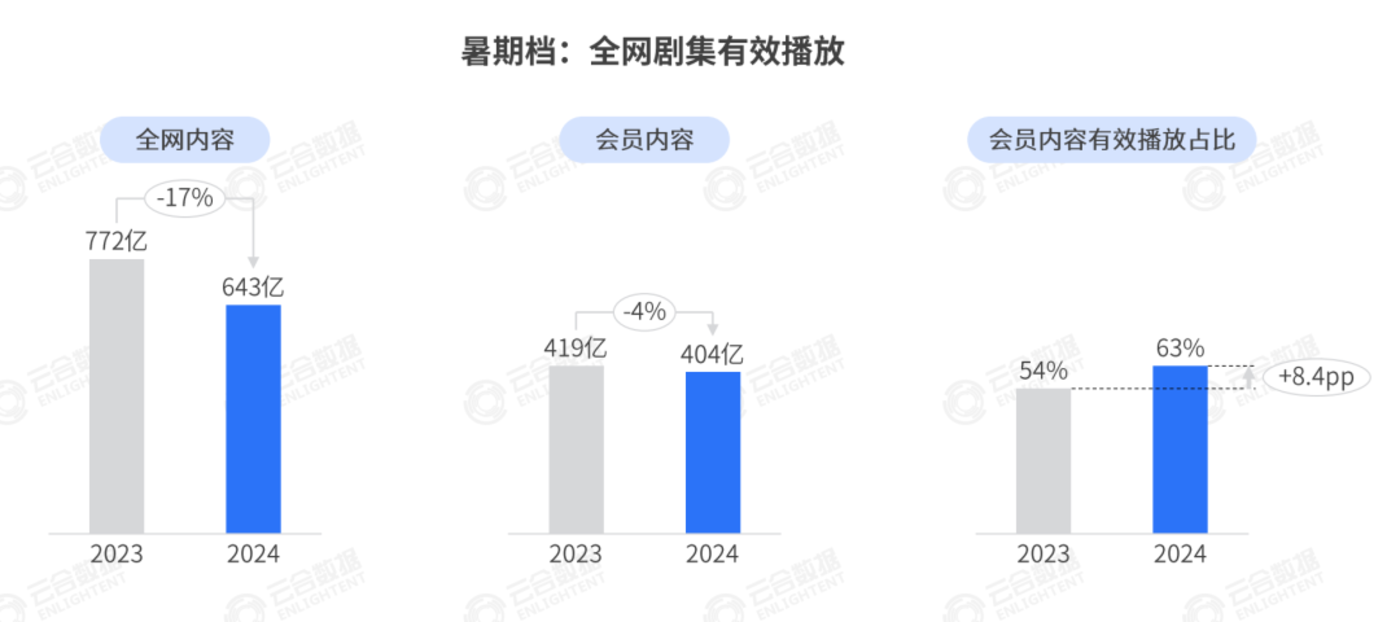 在这背后,其实能够看出平台的内容打法有所调整。比起押注不确定性更强的大爆内容,视频平台更稳妥的打法是做好垂类和腰部内容。尤其是在各平台会员机制愈发成熟的当下,激活付费用户的活跃度变得更加重要。从结果看,各平台也在今年暑期档交出不错的答卷,云合数据显示,在档期剧集有效播放量同比下滑的前提下,全网剧集会员内容的有效播放占比从去年的 54% 上涨至 63%,会员活跃度对内容市场的影响还在进一步加深。