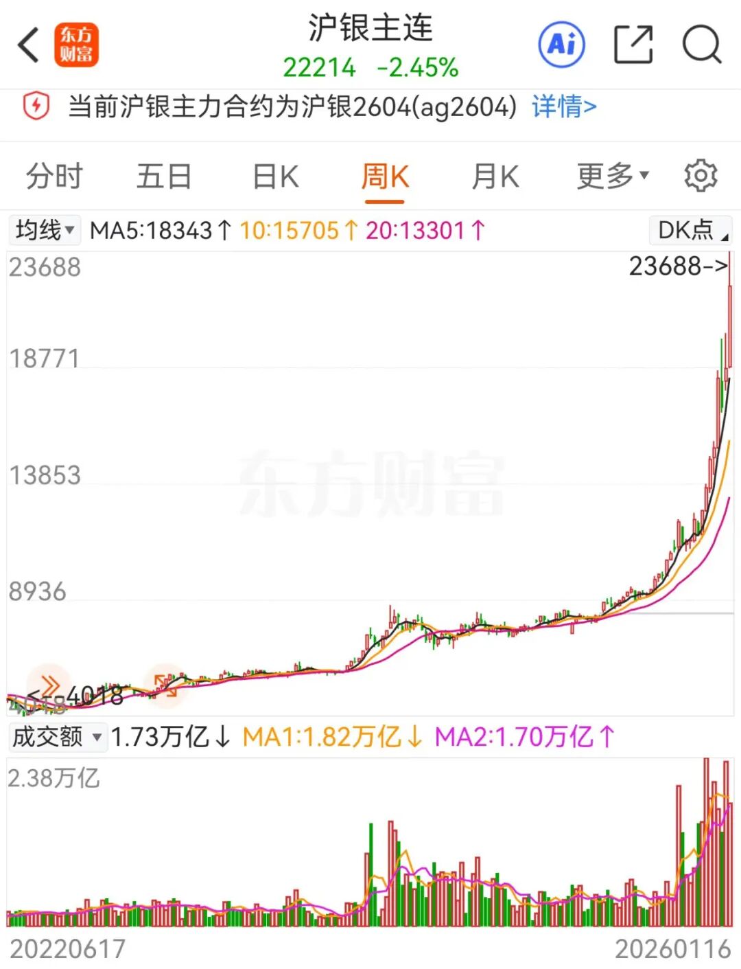 2022 年 3 月 30 日白银创下近五年中的最低点 4018,在这之后用了 3 年多时间才涨到一万左右。但从 2025 年 9 月 12 日银价破万之后,一路飙升,涨至昨天的最高价 23688,只花了四个月时间!也就是说,白银在过去四个月中实现了前面三年多的涨幅!