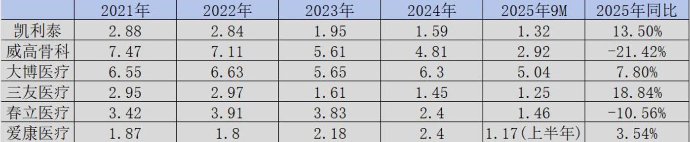 此外,集采政策有效压缩了行业中间流通环节,削减了不必要的市场营销开支,过去高企的渠道成本与营销费用得以大幅降低,各大骨科企业销售费用增长态势均明显放缓。其中,威高骨科的销售费用表现尤为典型:从 2021 年的 7.47 亿元逐年回落,2025 年前三季度仅为 2.92 亿元,较 2021 年同期降幅达 47.1%,降本增效成效显著。