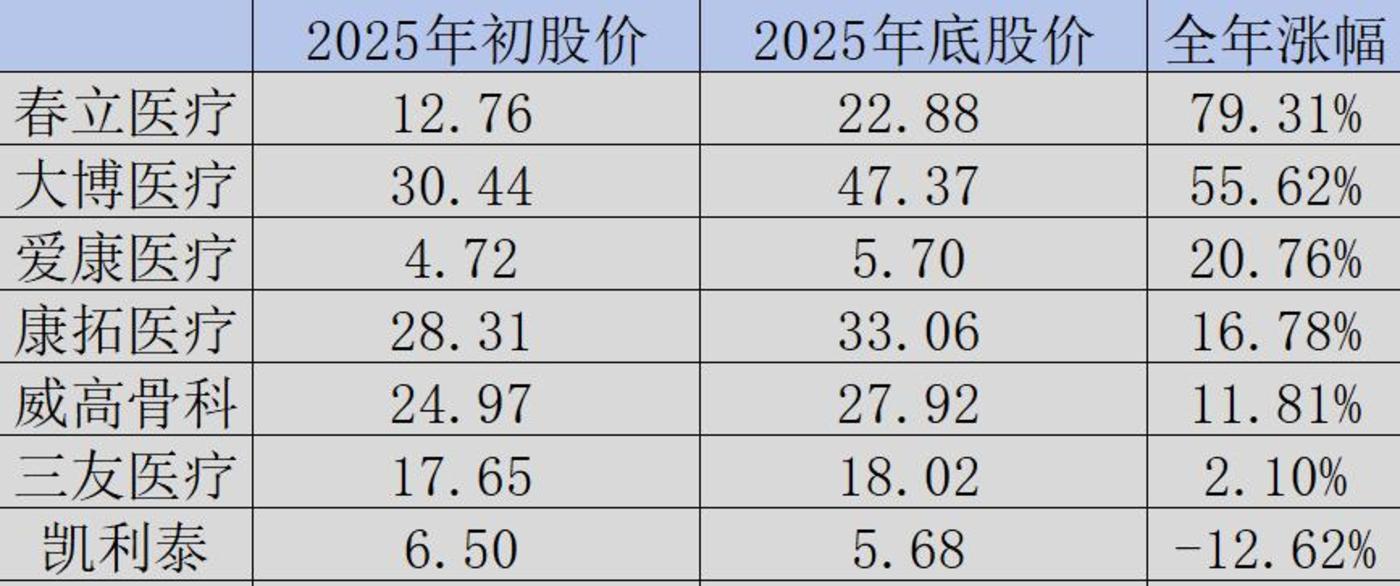 回望 2025 年,中国骨科板块走出强劲行情。在春立医疗、大博医疗的强势引领下,全年骨科头部企业股价平均涨幅达 24.82%;除因股权争夺陷入 ST 的凯利泰外,其余头部企业均实现股价上涨,行业复苏态势清晰可见。