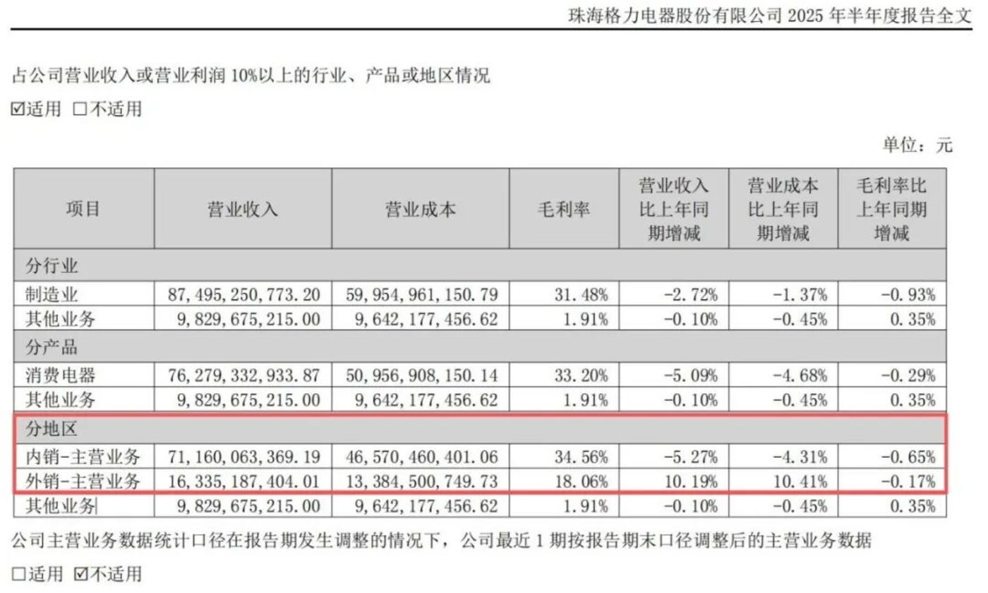 格力在海外的情况,就体现出品牌溢价缺失的困境。2025 年上半年,格力外销毛利率仅 18.06%,而内销毛利率高达 34.56%,近乎一倍的差距,背后正是品牌价值的鸿沟。