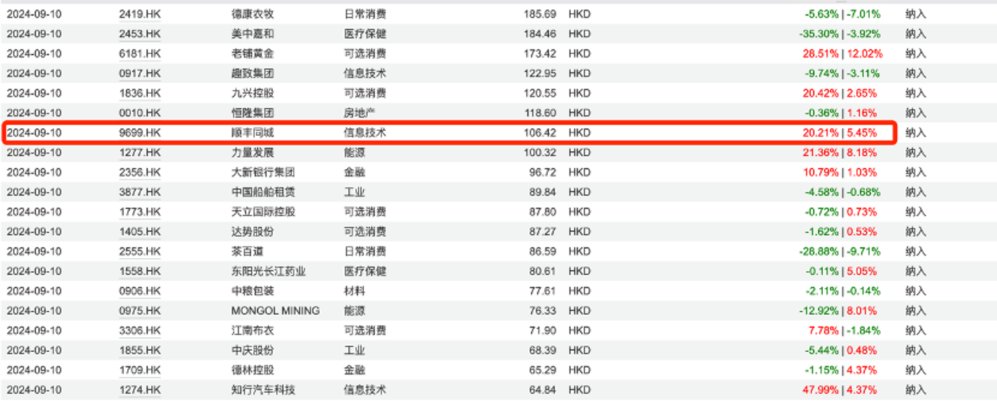 自 2024 年 9 月 10 日起,顺丰同城加入:1) 恒生综合指数;2) 恒生综合行业指数-工业;3) 恒生综合中小型股指数;4) 恒生综合小型股指数;及 5) 恒生港股通原材料及工业指数。