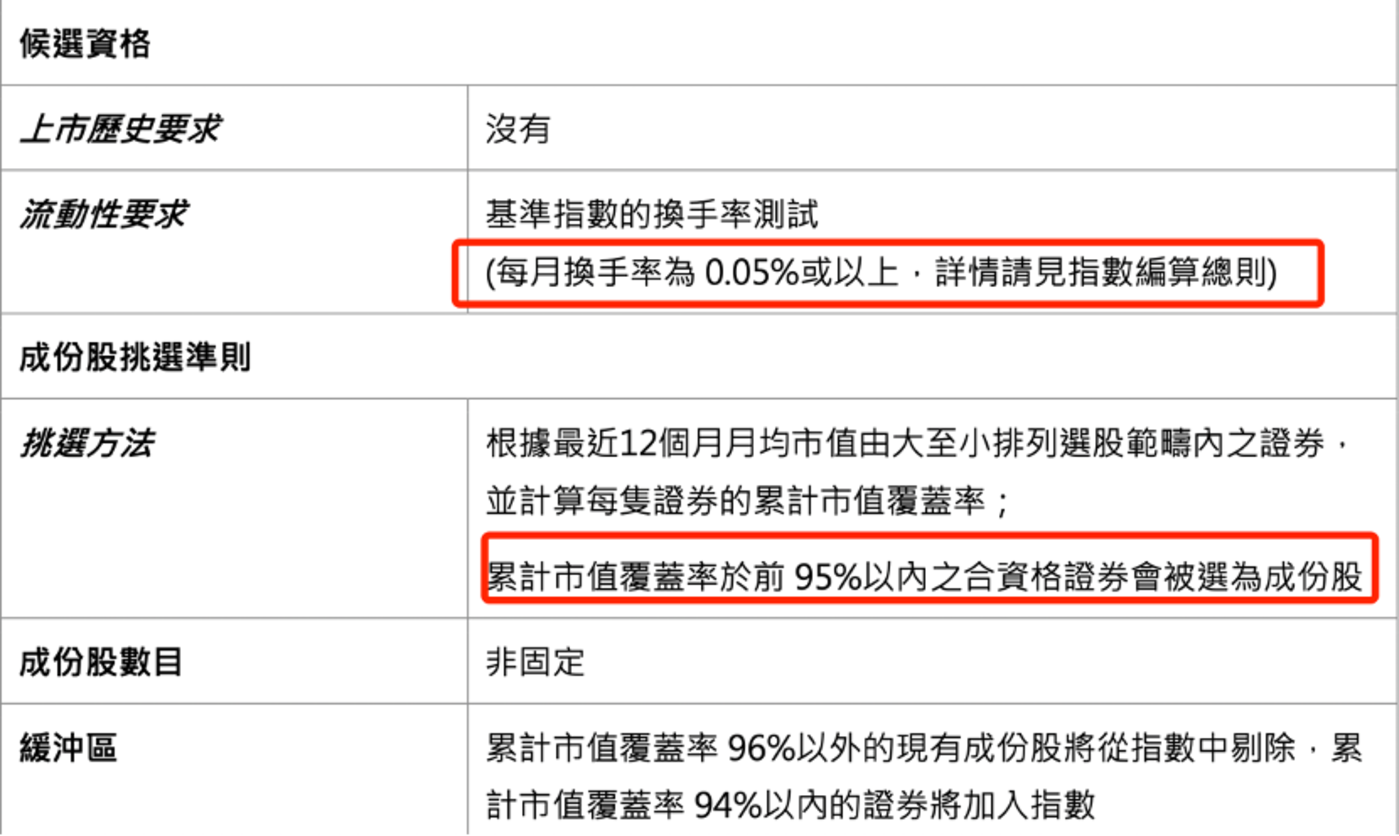 上图为恒生综合指数的选股标准,候选企业的市值要排在市场 95% 之前 (中大型企业才有资格入选),且要有一定的流动性 (每月换手率不得低于 0.05%),而纳入港股通其 12 个月内市值则不得低于 50 亿港币。