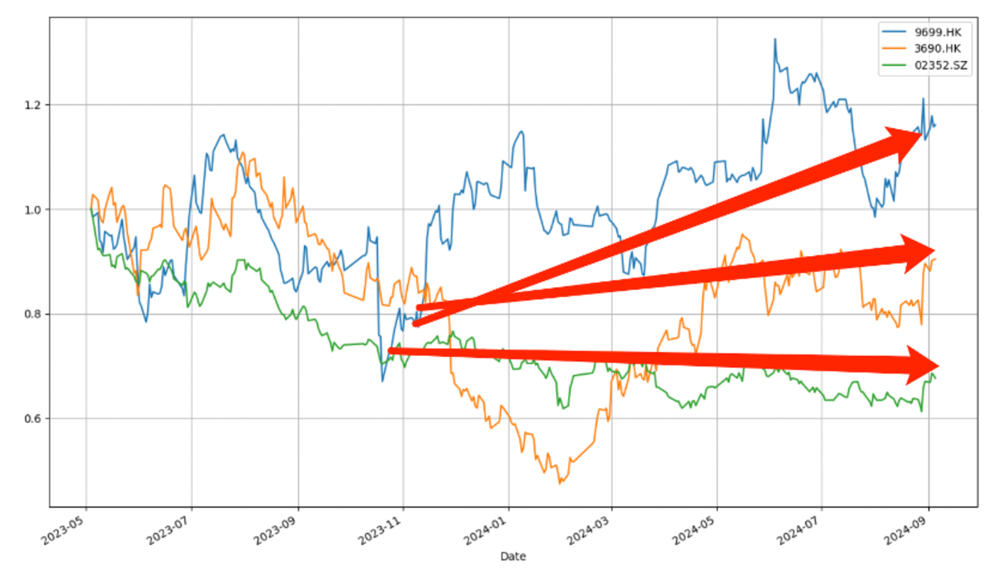 我们整理并制作了 2023 年 5 月以来顺丰同城与顺丰控股和美团股价的走势变化情况 (初始基点设为 「1」)。以 2023 年 10 月为分水岭,之前三家公司走势几乎保持高度的一致性,相关性乃是十分之高,在此之后三条折线便越发分化,尤其顺丰同城走势迥异于其他两家。