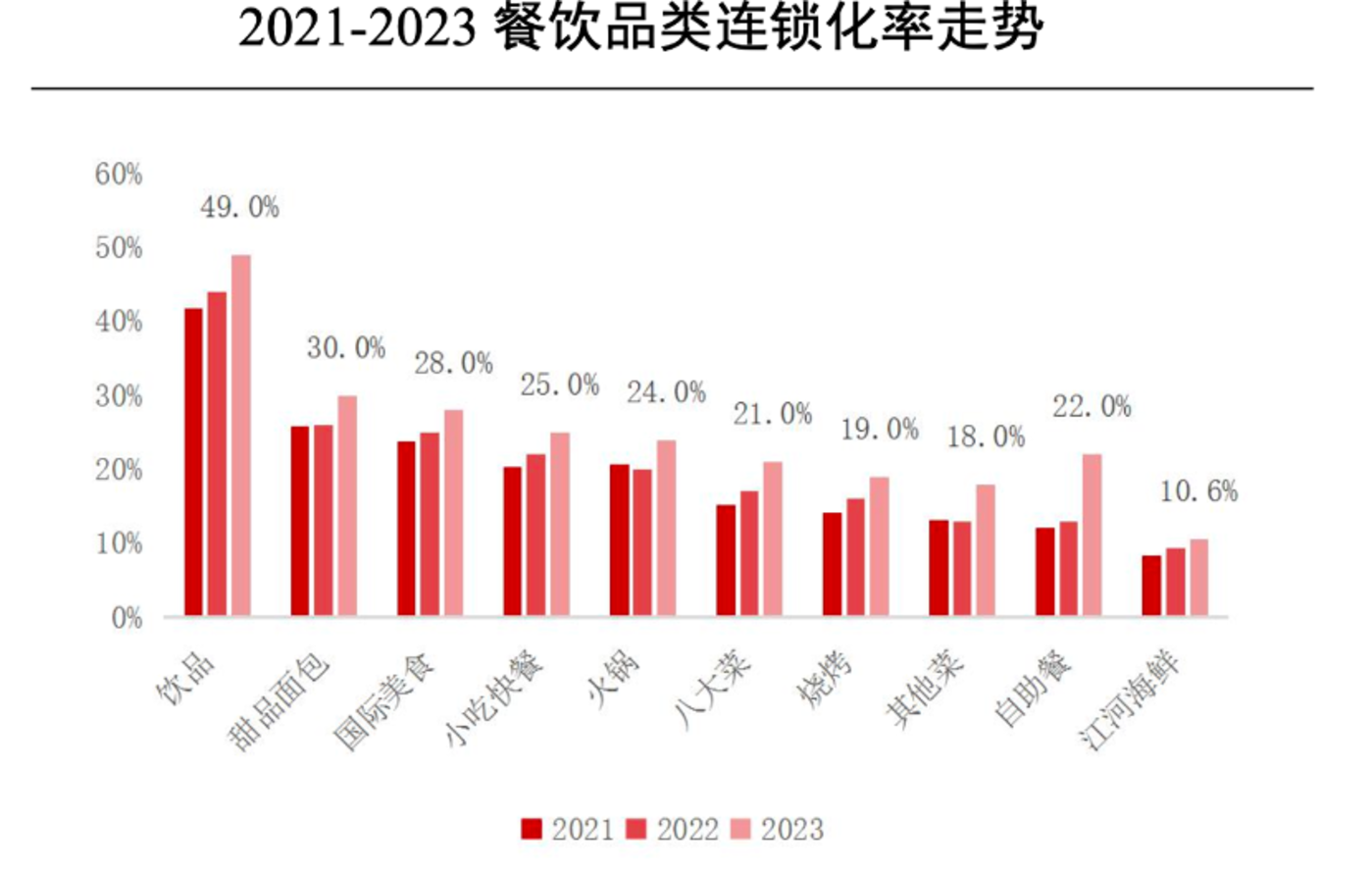 上图为山西证券制作的 2021-2023 餐饮分品类连锁化趋势,可以非常确切看到近年来各个细分领域都在进行连锁化的改造,其中饮品行业更为明显。