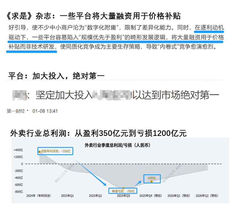 高盛等投行报告分析认为,外卖行业的年度总利润已经从盈利 350 亿元,至如今的亏损 1200 亿元。这仅是 2025 年 Q3、Q4 两个季度。