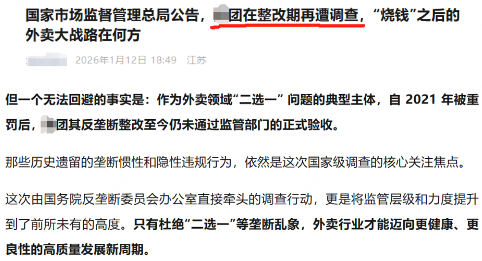 在此之前还有个小插曲,1 月 8 日,据多家媒体报道,阿里巴巴集团在面向投资者的交流会上表示,淘宝闪购将在 2026 年坚定加大投入,目标直指市场份额的“ 绝对第一”(2025 年 12 月的数据,美团与淘宝闪购的 GTV 占比为 6:4)。这也直接撞上监管层调查的节点。