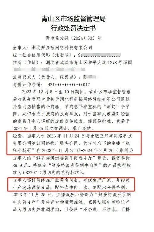 9 月 11 日,针对网友热议的 「小杨哥带货牛肉卷实为拼接肉」 一事,武汉青山区市监局回应称确有该处罚,而 「三只羊」 公司属地合肥市监局表示已关注到该情况。
