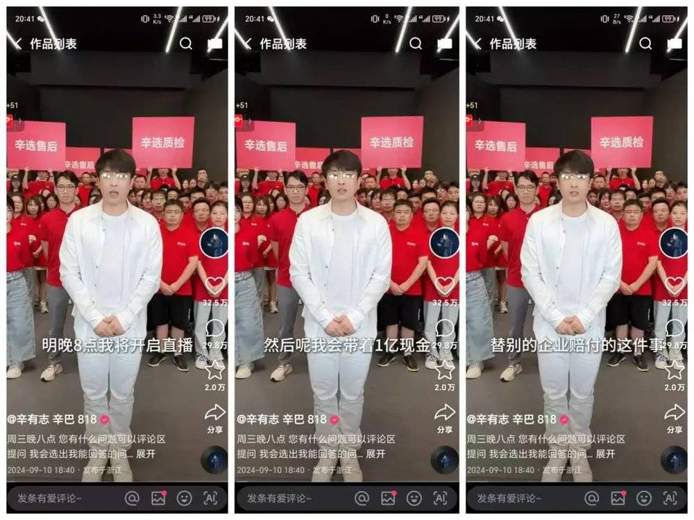 而在今日晚间,原本计划八点开播的主播辛巴,却遭到快手平台提前封禁。就在前一天,辛巴连续发布两条预告视频称,将组织 200 名客服、准备好 1 亿元资金,为此前其指责的小杨哥售后问题提供赔付。