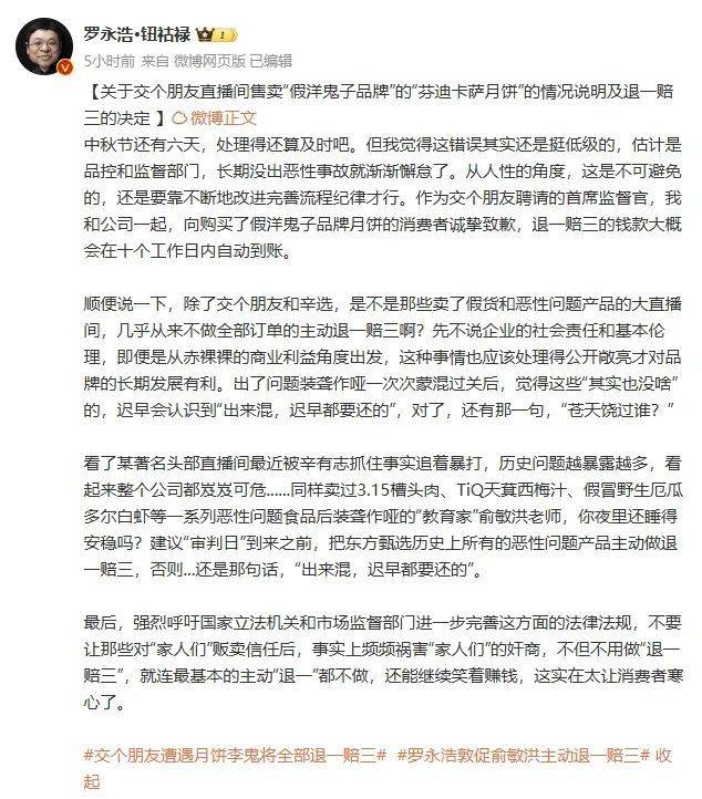 9 月 11 日早间,交个朋友直播间公开发文,称被品牌方蒙骗,遭遇 「李鬼」 月饼。罗永浩在其社交媒体上对此连续发文致歉,「作为交个朋友聘请的首席监督官,我和公司一起,向购买了假洋鬼子品牌月饼的消费者诚挚致歉。」